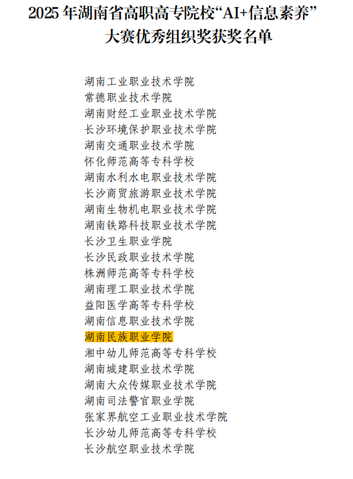 近日,2025 年湖南省高职高专院校 “AI + 信息素养” 大赛圆满落幕,我校师生捷报频传,斩获学生组、教师组多项个人奖项,学校成功获评“优秀组织奖”,尽显育人实力! 本次大赛由湖南省图书馆学会主办,聚焦 AI 素养与信息能力提升,吸引全省多所院校师生同台竞技。学生组历经校赛选拔、省赛线上比拼……